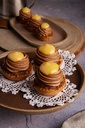 Casquinha de biscoito com recheio de creme de chocolate, de manteiga e de baunilha.